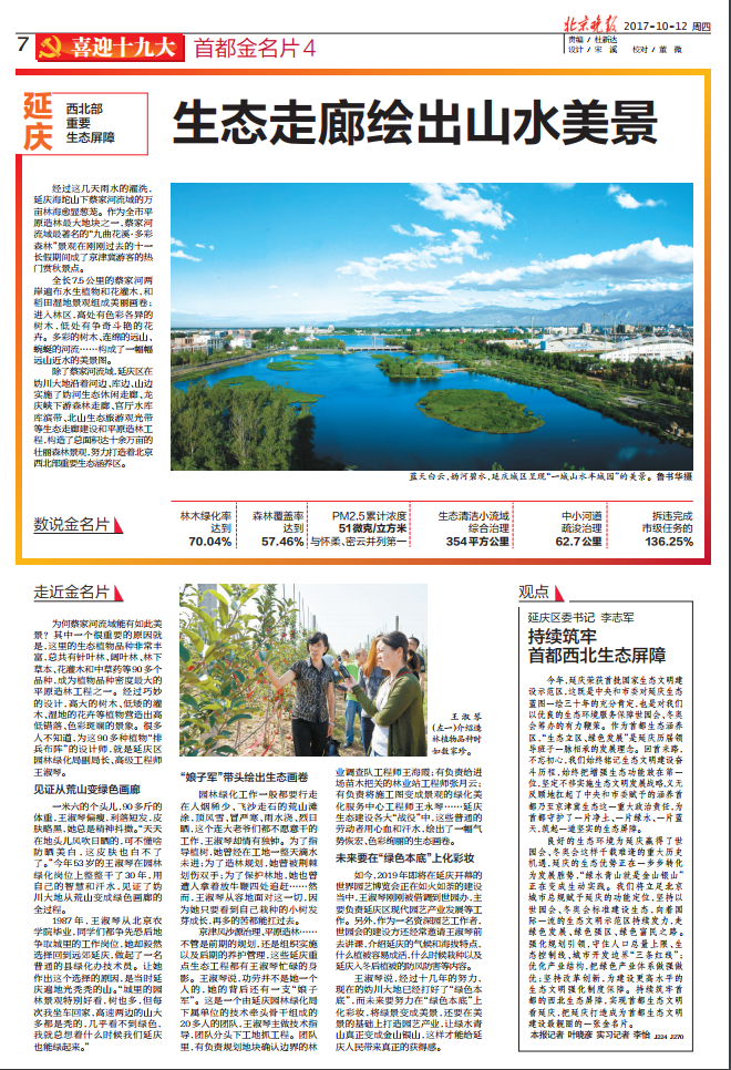 京津风沙源治理、平原造林……不管是前期的规划,还是组织实施以及后期的养护管理,这些延庆重点生态工程都有王淑琴忙碌的身影。王淑琴说,功劳并不是她一个人的,她的背后还有一支“娘子军”。这是一个由延庆园林绿化局下属单位的技术牵头骨干组成的20多人的团队,王淑琴主做技术指导,团队分头下工地抓工程。团队里,有负责规划地块确认边界的林业调查队工程师王海霞;有负责给进场苗木把关的林业站工程师张月云;有负责将施工图变成景观的绿化美化服务中心工程师王永琴……延庆生态建设各大“战役”中,这些普通的劳动者用心血和汗水,绘出了一幅气势恢宏、色彩绚丽的生态画卷。