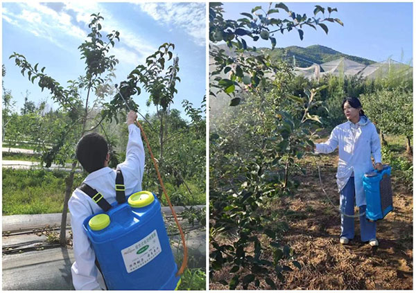 2023年,团队青年教师秦晓晓在真顺村遇到果农张大爷蹲在荒废的苹果园叹气:“套袋太苦,娃不让干;不套袋,苹果卖不上价……”那一刻,她想起团队教师常说的“科研温度”——论文不该躺在期刊里,要帮农民直起腰。团队立刻着手攻关“苹果免套袋技术”,为了准确测量数据,师生在接近40摄氏度的果园里一蹲就是一天。学生小周抹把汗笑道:“秦老师,咱这是给苹果‘敷面膜’啊!”团队将研发出的“苹果面膜”——液态生物膜喷在果面,形成会“呼吸”的保护膜。