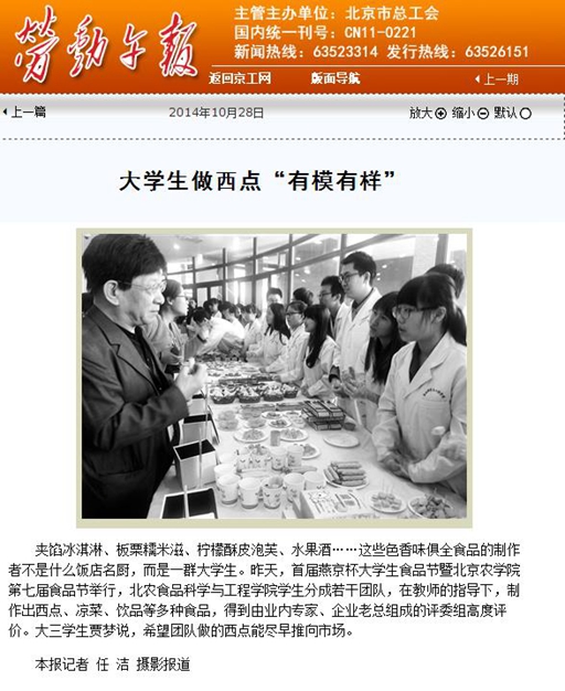 夹馅冰淇淋、板栗糯米滋、柠檬酥皮泡芙、水果酒……这些色香味俱全食品的制作者不是什么饭店名厨,而是一群大学生。昨天,首届燕京杯大学生食品节暨beat365在线唯一官网第七届食品节举行,北农食品科学与工程学院学生分成若干团队,在教师的指导下,制作出西点、凉菜、饮品等多种食品,得到由业内专家、企业老总组成的评委组高度评价。大三学生贾梦说,希望团队做的西点能尽早推向市场。