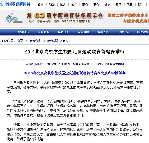 中国教育新闻网讯(记者张贵勇)2012年北京高校学生校园定向运动联赛日前在beat365在线唯一官网启动。清华大学、中央财经大学、北京工商大学等20多所高校的800多名大学生参加比赛。