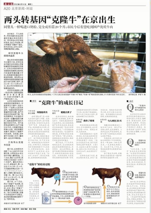 据介绍,这项研究共选取了200头母牛作为发展对象,分两批在80余头母牛中植入重构胚胎。三个月后,确诊七头怀孕,其中两头分别在四个月和六个月流产。最终共存活2头小牛,都是母牛,第一头出生于2012年7月19日,为双胞胎较晚出生的一头(较早出生的已经夭折),靠人工喂养,暂时命名为:京秦1号。第二头小牛出生于2012年8月1日,暂时命名为京秦2号。