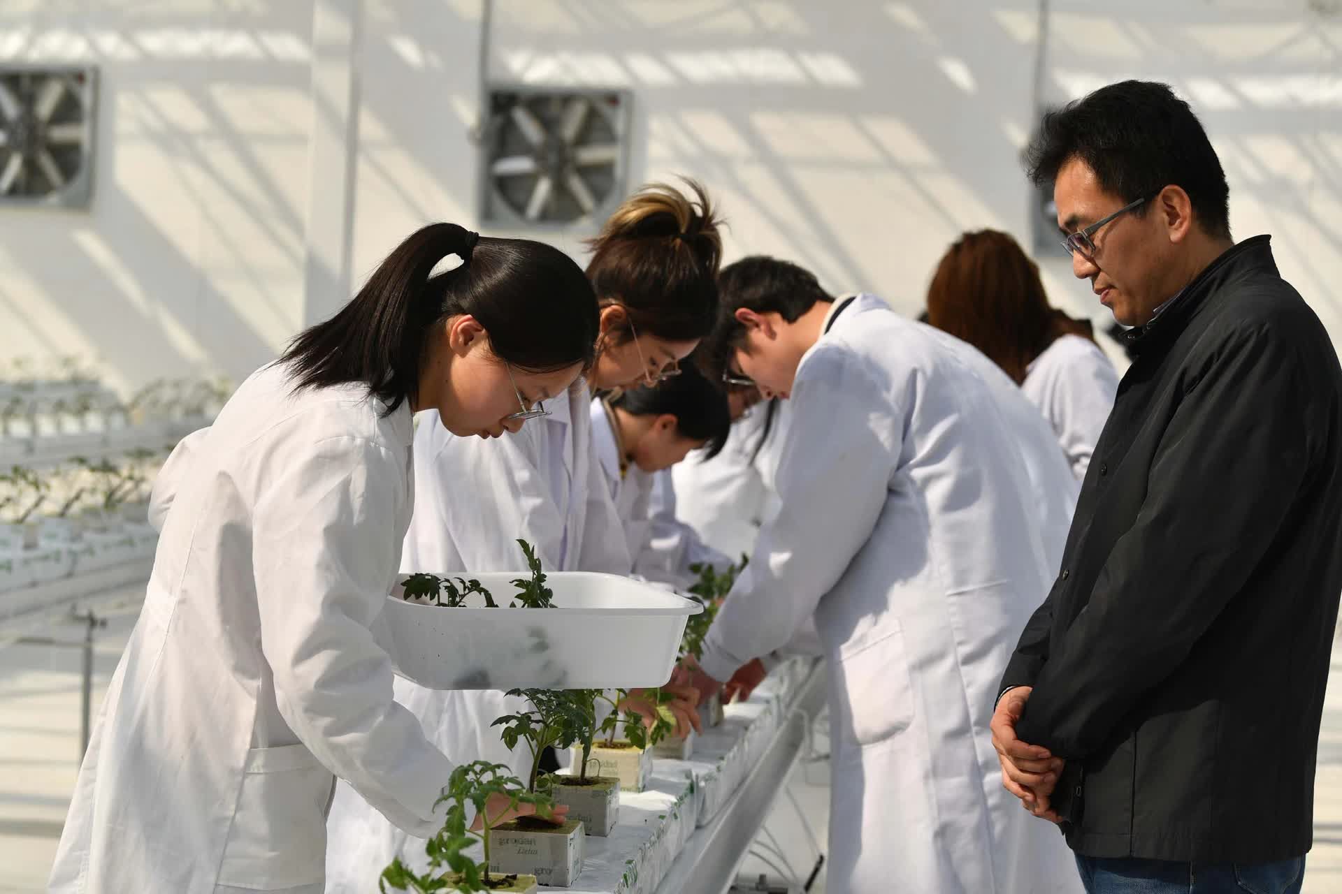 当天,一节实践教学课在温室里开讲,该校植物科学技术学院副教授刘超杰带领园艺专业本科生开展番茄苗的定植工作。“栽培架上安装了果菜吊蔓岩棉栽培系统,内含自动给排水、水肥一体化等自动控制设备。”刘超杰指导学生将番茄苗移栽到泡了水的岩棉里,小心地掸去多余的土壤,“植物的根系会慢慢地在岩棉里扎根,不再需要土壤给予养分,自控系统一旦监测到植物缺水、缺营养,就会自动补给。”他说,未来将带领学生在这里开展新品种的开发和种植新技术的研究和试验。