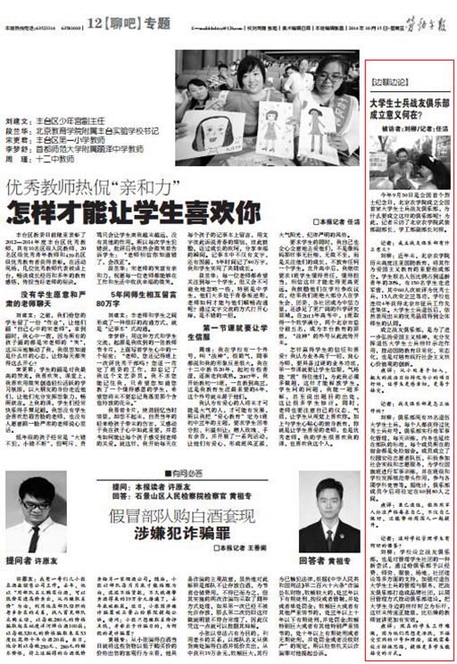 刘柳:学校设立战友俱乐部,也是对管理学生社团的一种新尝试,通过给俱乐部予以经费、师资、服装、场地、社团建设等多方面的支持,加强对退伍大学生士兵的管理与服务,把战友俱乐部打造成品牌社团,以项目管理方式推动俱乐部建设。把大学生身边的榜样树立为标杆,这样来传递正能量,比枯燥的教师宣讲更加有实效。