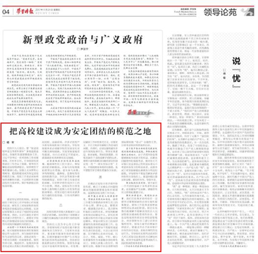 党的十九大提出,要“促进高校毕业生等青年群体”多渠道就业创业,加强和改进思想政治工作。习近平总书记一直对高校工作高度重视,2016年12月,在全国高校思想政治工作会议上强调,要坚持不懈促进高校和谐稳定,培育理性平和的健康心态,加强人文关怀和心理疏导,把高校建设成为安定团结的模范之地。高校工作者必须始终保持清醒的头脑,主动预防和化解高校的内部矛盾,维护和谐稳定的校园环境。