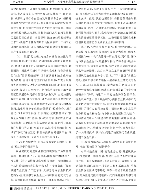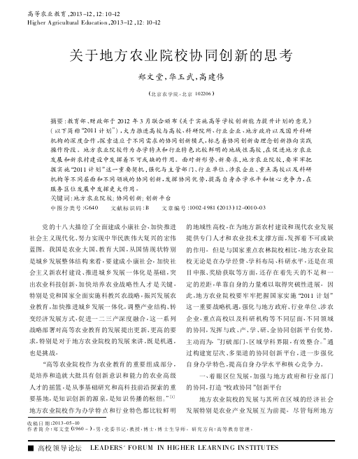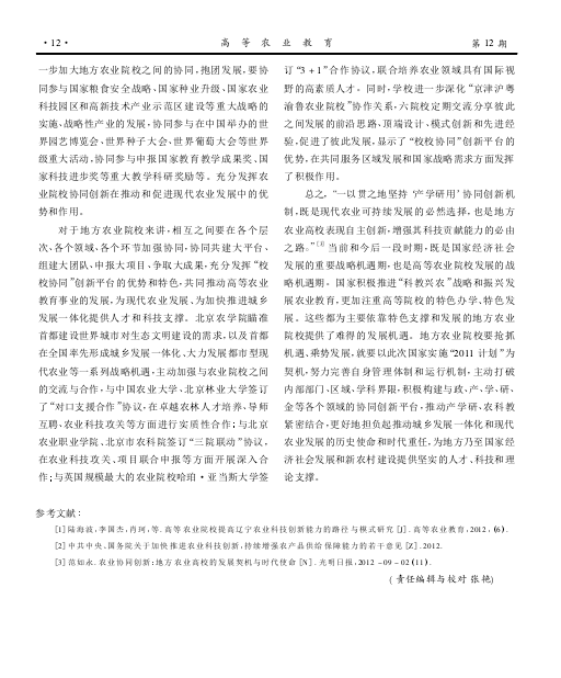 总之,“一以贯之地坚持‘产学研用’协同创新机制,既是现代农业可持续发展的必然选择,也是地方农业高校表现自主创新,增强其科技贡献能力的必由之路。”当前和今后一段时期,既是国家经济社会发展的重要战略机遇期,也是高等农业院校发展的战略机遇期。国家积极推进“科教兴农”战略和振兴发展农业教育,更加注重高等院校的特色办学、特色发展。这些都为主要依靠特色支撑和发展的地方农业院校提供了难得的发展机遇。地方农业院校要抢抓机遇、乘势发展,就要以此次国家实施“2011 计划”为契机,努力完善自身管理体制和运行机制,主动打破内部部门、区域、学科界限,积极构建与政、产、学、研、金等各个领域的协同创新平台,推动产学研、农科教紧密结合,更好地担负起推动城乡发展一体化和现代农业发展的历史使命和时代重任,为地方乃至国家经济社会发展和新农村建设提供坚实的人才、科技和理论支撑。