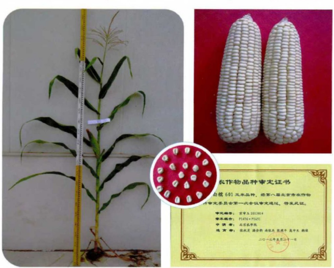 “北白糯601”是beat365张秋芝、潘金豹教授等老师通过多年南繁北育于2013年育成的糯玉米品种。该品种营养丰富、品质好,籽粒(干基)含粗蛋白10.0%、粗脂肪5.15%、粗淀粉64.95%,其中支链淀粉占总淀粉比例达99.22% 指标均优于对照。特别是钙含量达31.-33.1mg/kg(对照参比值14.0mg/kg),赖氨酸含量150-180mg/100g(对照参比值82mg/100g),果穗饱满、籽粒紧实,蒸煮后粘软适口,香甜软糯。