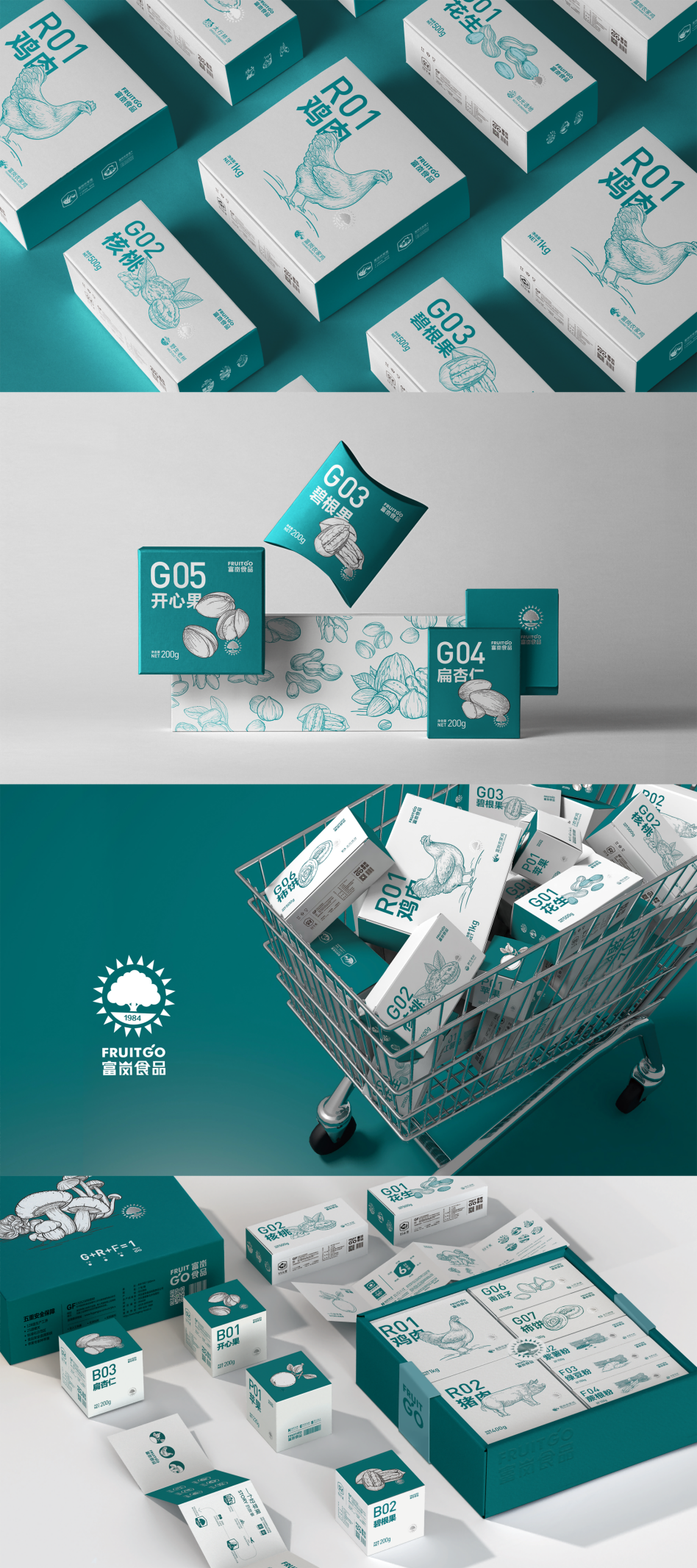 地处太行山深处的岗底村是河北省邢台市乡村振兴示范村镇,毛洋团队作品《富岗食品品牌设计》聚焦岗底村特色农副产品推广需求,通过为本地富岗食品有限公司开展包装设计,促进特色农产品品牌化建设。团队为富岗食品品牌的干果、杂粮、香菇、肉蛋等十多个系列的农产品绘制了复古风格插图,以统一的品牌颜色和醒目编号营造强烈的整体货架印象。采用标准化的包装模数解决了一百多种产品包装的管理问题,礼盒套装也能更好地满足消费者多样化、个性化购物需求。该包装设计自上市以来,已帮助两万余名果农和当地群众提高经济效益,为激活乡村新动能,助力乡村产业振兴做出了积极贡献。