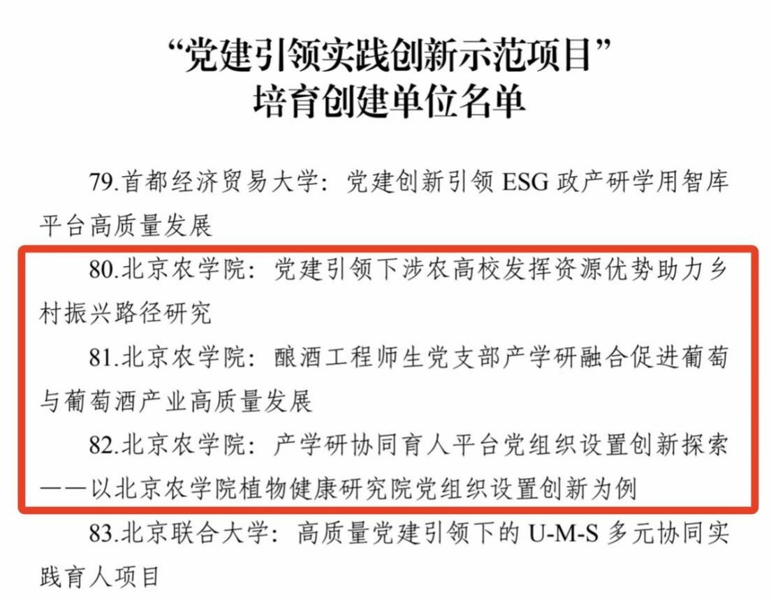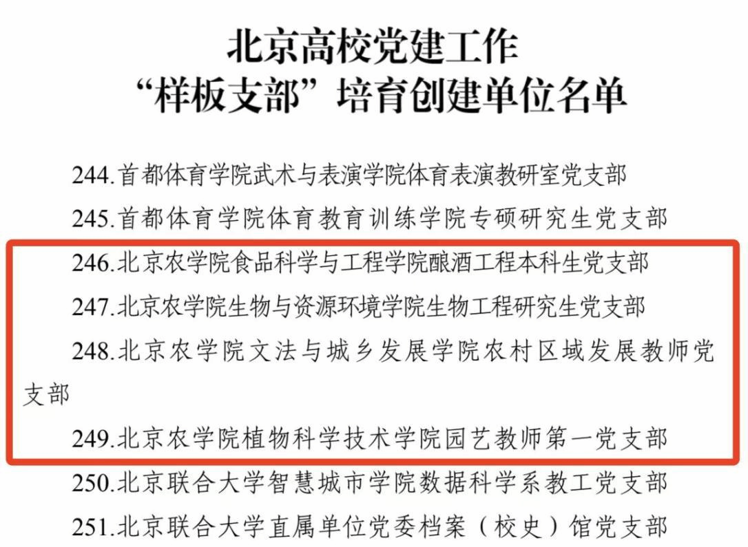 近日,北京市委教育工委公布了北京高校党建工作“标杆院系”“样板支部”“党建引领实践创新示范项目”培育创建单位名单,beat365在线唯一官网申报的9项全部榜上有名。其中植物科学技术学院党委和生物与资源环境学院党委入选北京高校党建工作“标杆院系”培育创建单位;食品科学与工程学院酿酒工程本科生党支部、生物与资源环境学院生物工程研究生党支部、文法与城乡发展学院农村区域发展教师党支部、植物科学技术学院园艺教师第一党支部入选北京高校党建工作“样板支部”培育创建单位;“党建引领下涉农高校发挥资源优势助力乡村振兴路径研究”“产学研协同育人平台党组织设置创新探索——以beat365在线唯一官网植物健康研究院党组织设置创新为例”“酿酒工程师生党支部产学研融合促进葡萄与葡萄酒产业高质量发展”三个项目入选“党建引领实践创新示范项目”培育创建单位。
