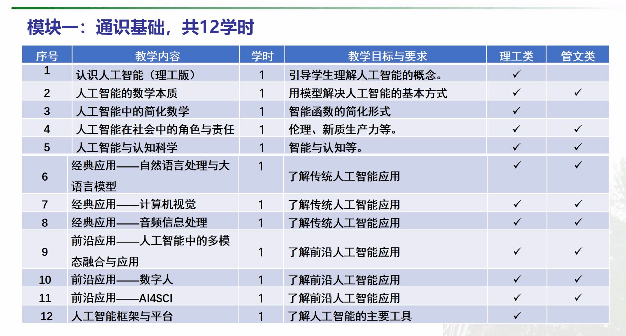 课程分为《人工智能导论A》和《人工智能导论B》。前者面向理、工及农类专业,后者则面向管理类及文科专业。通过课程学习,学生将了解人工智能的基本概念、发展历程、主要研究领域和前沿动态,理解机器学习、深度学习等核心技术的原理和基本算法,熟悉人工智能在不同领域的典型应用案例,能够分析和理解复杂的人工智能算法和模型的逻辑结构,提升创新思维,增强对人工智能伦理和社会影响等问题的认识和理解,培养学生的社会责任感和人文素养,使他们能够在未来面对人工智能相关决策时做出正确的价值判断。