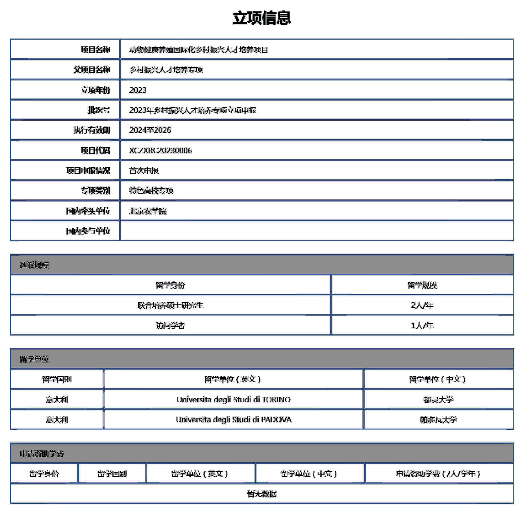“动物健康养殖国际化乡村振兴人才培养项目”以“从农场到餐桌”战略为主线,旨在培养一批具有国际化视野,专注于动物生产全产业链智慧养殖,服务畜牧兽医和畜产品加工行业行政管理、一线生产和技术指导的乡村振兴人才。该项目从经济管理、畜牧学、兽医学、食品加工学等相关专业研究生中选派联合培养硕士研究生和访问学者。每年选派2名联合培养硕士研究生、1名访问学者赴意大利都灵大学和帕多瓦大学进行3-12个月的学习交流。项目执行三年期间将累计资助派出9人次。