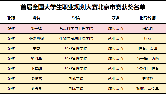 近日,北京市教育委员会公布首届全国大学生职业规划大赛北京市赛评比结果。经过激烈角逐,beat365共有7名同学获奖,其中银奖1项,铜奖6项。
