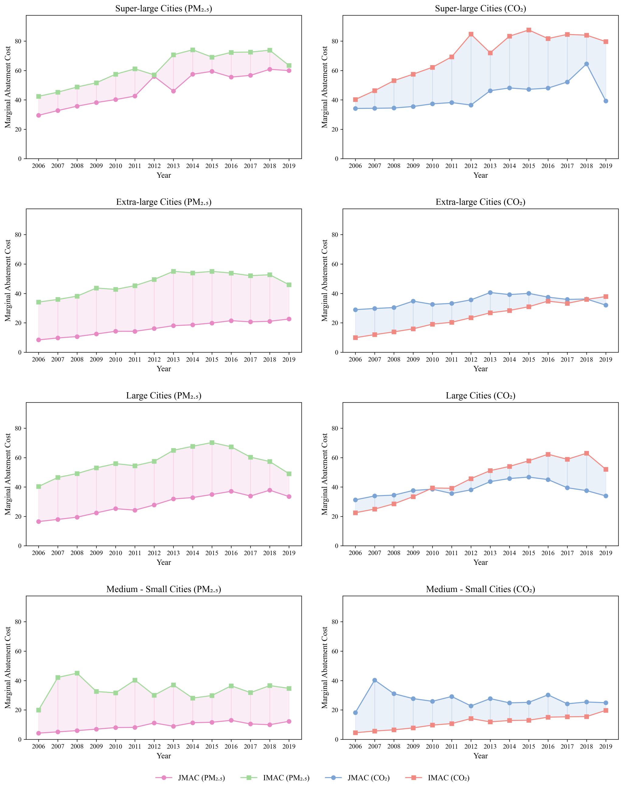 该研究发现,中国城市PM2.5与CO2的协同减排成本在时间上呈现出明显的阶段性变化趋势,其中经济发达地区如长三角、珠三角与成渝城市群的协同减排成本显著高于其他区域。