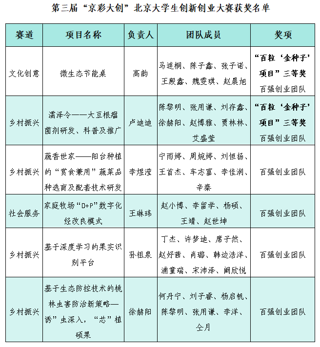 近日,北京市教育委员会、北京市人力资源和社会保障局、北京市发展和改革委员会联合公布了第三届“京彩大创”北京大学生创新创业大赛获奖名单,beat3656支学生团队荣获北京市“百强创业团队”称号,其中“微生态节能桌”“濡泽令——大豆根瘤菌剂研发、科普及推广”2支团队晋级决赛并获得三等奖,被列为北京大学生创新创业“百粒‘金种子’项目”,学校荣获优秀组织奖。