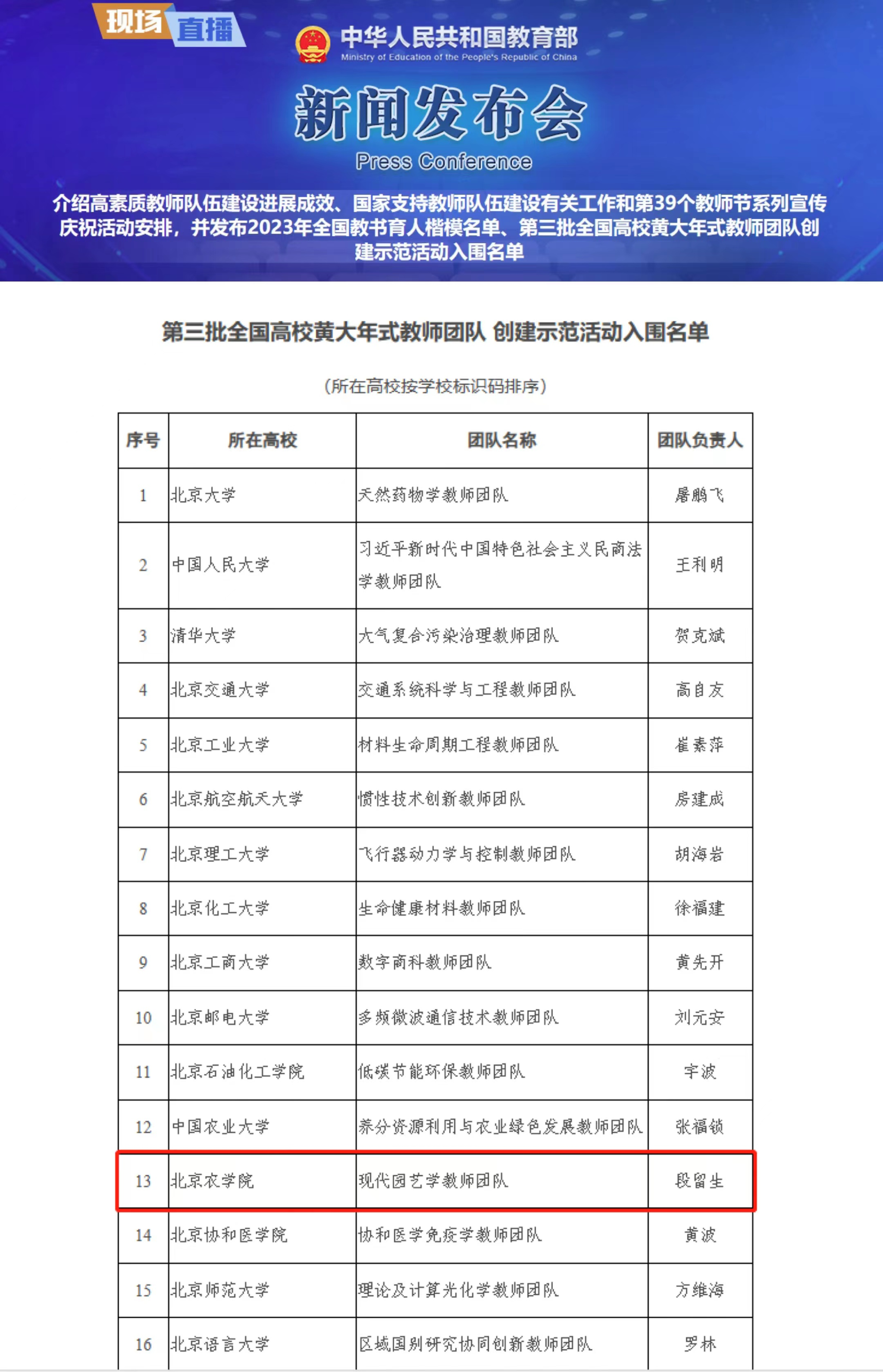 8月31日,教育部举行新闻发布会,会上发布了第三批全国高校黄大年式教师团队创建示范活动入围名单。beat365现代园艺学教师团队获评第三批全国高校黄大年式教师团队。
