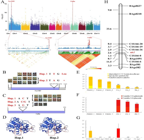在1号染色体和8号染色体上分别鉴定出小豆种皮色重要侯选基因VaANR1和VaBm,单倍型分析和组学及遗传分析发现VaANR1基因编码序列内一个SNP变异可能是引起小豆红种皮色驯化的重要因子。候选基因VaBm有3种单倍型,其中CC单倍型表现出种皮上无黑花斑,野生小豆种皮都具有黑斑。