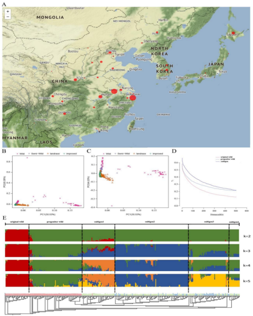 对来源广泛的322份野生小豆、半野生小豆、栽培小豆地方品种和育成品种进行全基因组重测序分析,揭示了中国野生小豆遗传多样性高且为最原始类型,推测中国长江中下游流域应是小豆起源驯化中心。构建了综合性小豆基因组变异图谱,揭示了小豆进化和驯化模式。