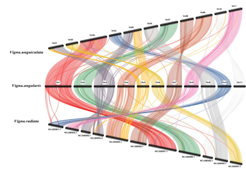 比较基因组学研究分系基因家族的进化、获得全面的系统发育树,鉴定了小豆和其他十一个物种之间独特且共享的基因家族。揭示小豆第3号和5号染色体发生断裂融合,发现小豆5号染色体在豇豆属中独立存在,并具有受到单独驯化的重要区间,可能使得其区别于豇豆属的绿豆和豇豆等物种。