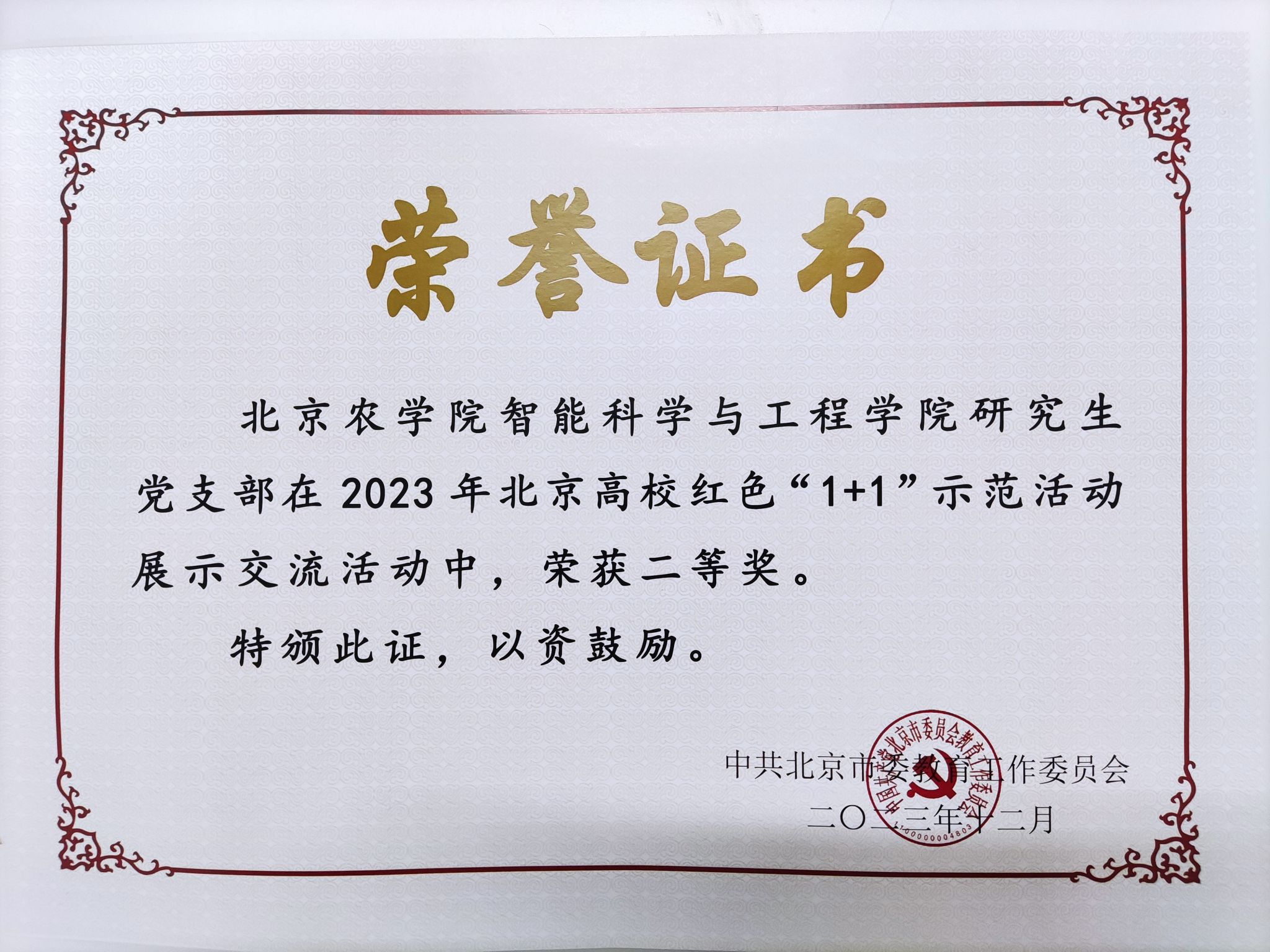 不断增强基层党组织政治功能和组织功能,落实落细基层组织工作条例,落实二级党组织书记工作例会制度,强化校院两级领导干部联系师生党支部工作制度,着力建强上下贯通、执行有力的组织体系。大力建设“政治功能强、支部班子强、党员队伍强、作用发挥强”党支部,持续开展校级党建“双创”“两优一先”、党建和思想政治工作成果评选表彰活动。智能学院研究生党支部荣获2023年北京高校红色“1+1”示范活动二等奖,2名共产党员、1个基层党组织获北京高校“两优一先”表彰,动物科学技术学院动物科学教工党支部获评第四批“全国党建工作样板支部”。