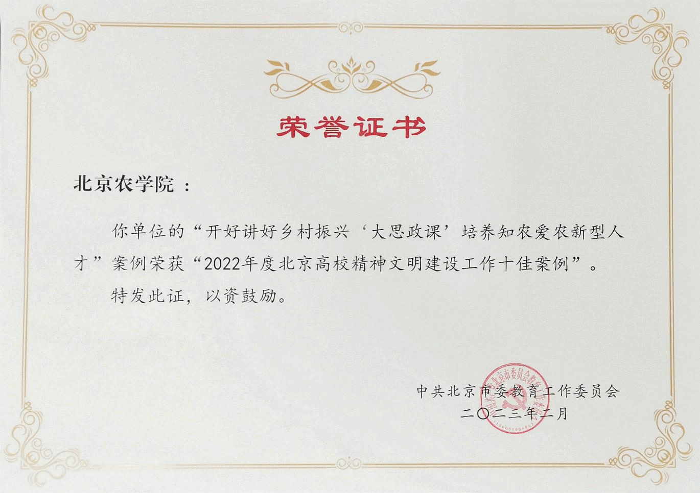 构建“大思政”育人格局。坚决贯彻落实中央和市委关于思政课改革创新的部署和要求,打造“首善标准、红色基因、北农特色”的思政金课,全面推进习近平新时代中国特色社会主义思想“三进”工作,大力推进“四史”教育融入思政课教学,获评北京高校精神文明建设“十佳案例”。2门课程思政案例获评“全国高等农林院校课程思政建设研讨会”优秀教学案例,3个项目获评“北京高校思想政治工作创新示范项目”,6个项目全部被评为2023年度北京高校师生服务新时代首都发展“双百行动计划”优秀示范项目,在全市高校名列第一。