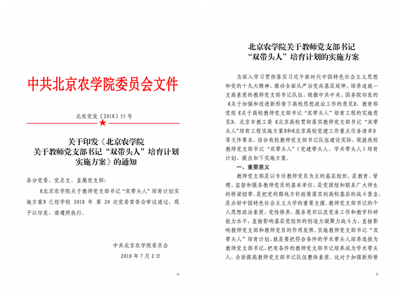 近年来,学校党委加强教师队伍建设党建引领,把党的政治建设摆在首位,牢牢把握党对教师队伍建设的领导权,深入推进党建工作与事业发展“一融双高”。立足学校办学特色和农林院校学科、专业、人才优势,系统谋划设计“1+3+N”党建工作模式,以“1个全链条培养机制建强教师党支部书记队伍、3大工程持续发挥教师党支部引领作用、搭建N个教师服务乡村振兴干事平台”,全面提升教师党支部的引领力、战斗力、凝聚力、执行力,在服务首都全面推进乡村振兴、率先基本实现农业农村现代化的进程中书写“北农答卷”。