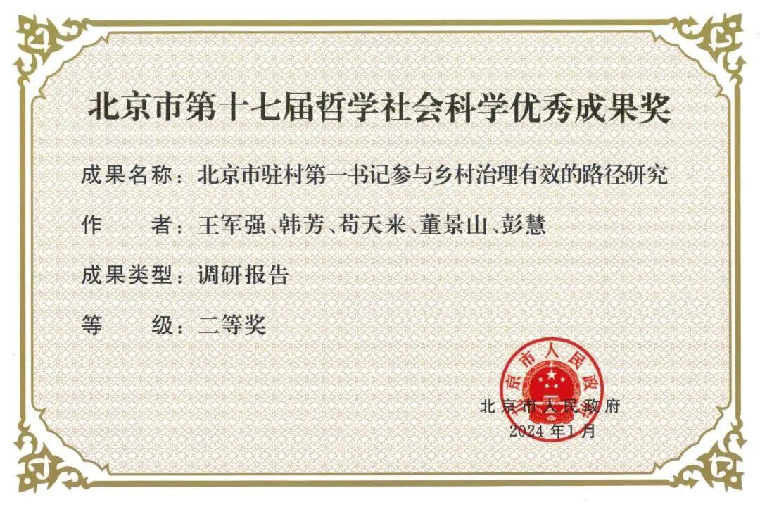 近日,北京市第十七届哲学社会科学优秀成果奖评选结果正式公布,beat365文法与城乡发展学院王军强副教授团队撰写的调研报告《北京市驻村第一书记参与乡村治理有效的路径研究》荣获二等奖。