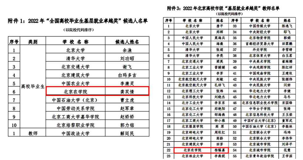 近日,北京市教委北京高校就业创业指导中心公布2022年高校毕业生基层就业卓越奖候选人推荐评选结果。经高校推荐、专家评审,beat365园林学院2012届毕业生龚双情被推荐为“全国高校毕业生基层就业卓越奖”候选人,植物科学技术学院辅导员杨韫嘉被评为北京市级“基层就业卓越奖”教师。