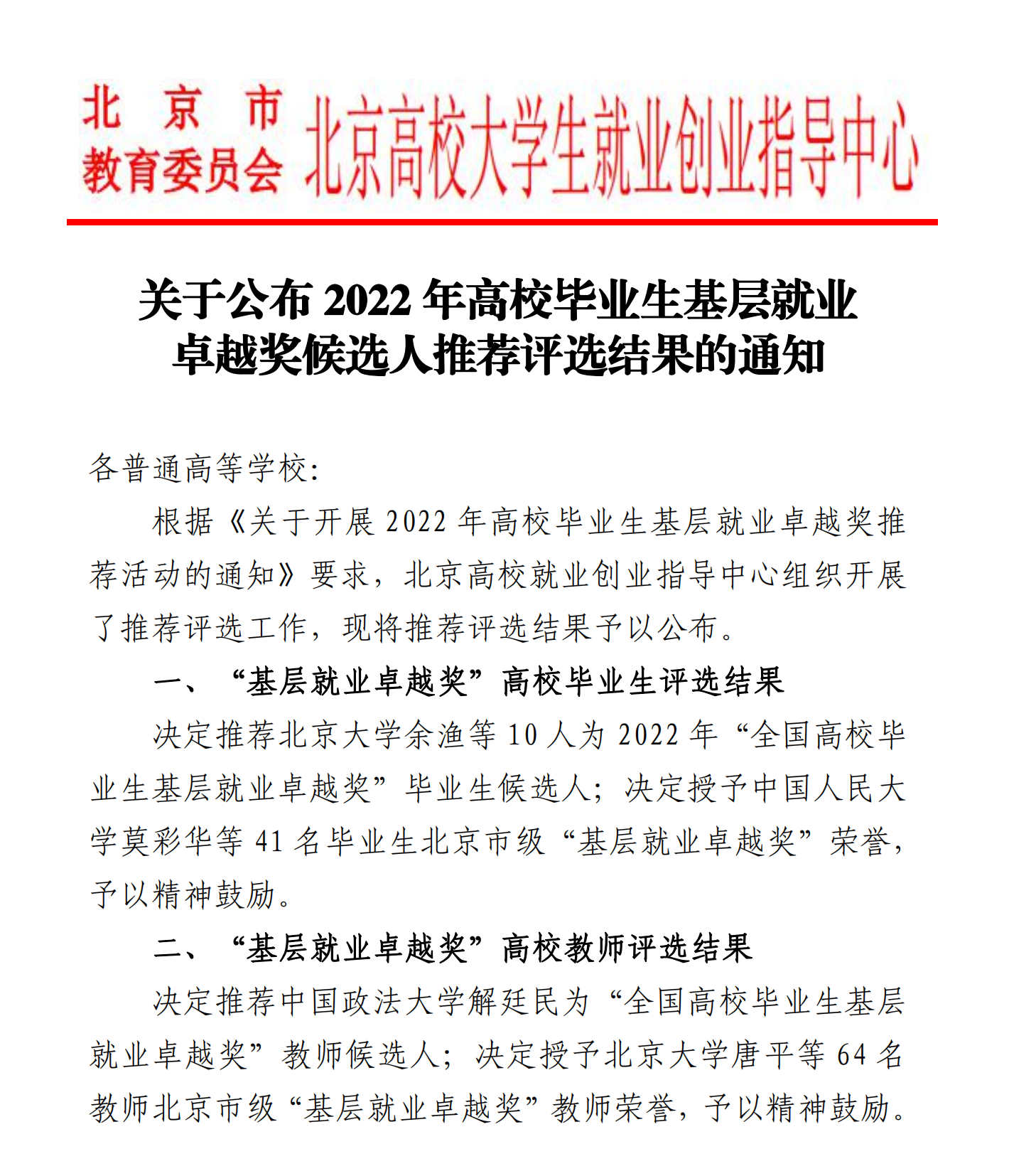 据悉,“高校毕业生基层就业卓越奖”是为奖励赴基层就业并做出突出业绩的普通高校毕业生和普通高校在指导服务大学生赴基层就业工作方面做出突出贡献的教师。此次评选共推荐10人为2022 年“全国高校毕业生基层就业卓越奖”候选人;授予64名教师北京市级“基层就业卓越奖”教师荣誉。
