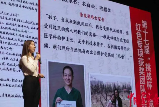 7月14日,2023年全国大学生“三下乡”“返家乡”社会实践启动周系列活动现场,来自南京大学新闻传播学院“红色家书”传播小组的代表陈丽敏做主题为《寻访百封红色家书 重温百年壮阔征程》的分享。中青报·中青网记者 陈剑/摄