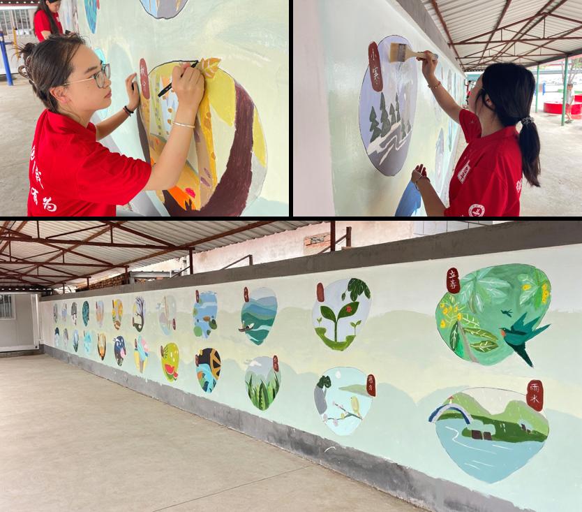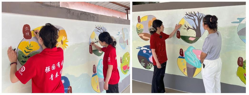 基于扎实的调研,实践团充分发挥专业特长,以墙体为创作载体,将中国传统二十四节气文化融入乡村景观。从“立春”枝头初绽的嫩芽,到“秋分”田间沉甸甸的硕果,师生们顶着炎炎烈日,历时五天完成二十四幅主题彩绘,总面积达120平方米。一幅幅生动画面不仅美化了村庄环境,更成为传播农耕文明、唤醒文化记忆的“露天课堂”。村民们驻足彩绘墙前,辨认画中节气、询问农事典故,师生们热情讲解画面背后的文化内涵与农时智慧。