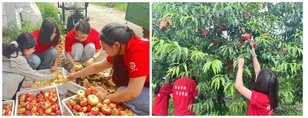 实践团师生们前期与村委展开专题座谈,深入了解寅洞村“桃产业+文旅融合”发展模式,并积极参与摘桃、去袋、分拣、装箱等农事劳作,了解乡村特色产业发展现状和需求。