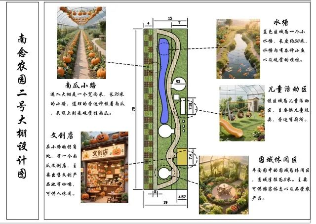 在南埝头村“南念农园”现代化种植基地,实践团成员深入调研南瓜种植流程与农园运营需求,结合农园“乡村旅游+农业体验”的发展定位,团队充分发挥专业优势,设计完成涵盖南瓜小路、儿童活动区、文创展示区及休闲体验区的农园景观规划方案。方案通过一条2米宽、70米长的南瓜主题景观带串联各功能区,将农业生产与休闲体验有机融合,为农园吸引游客提供了创新思路。