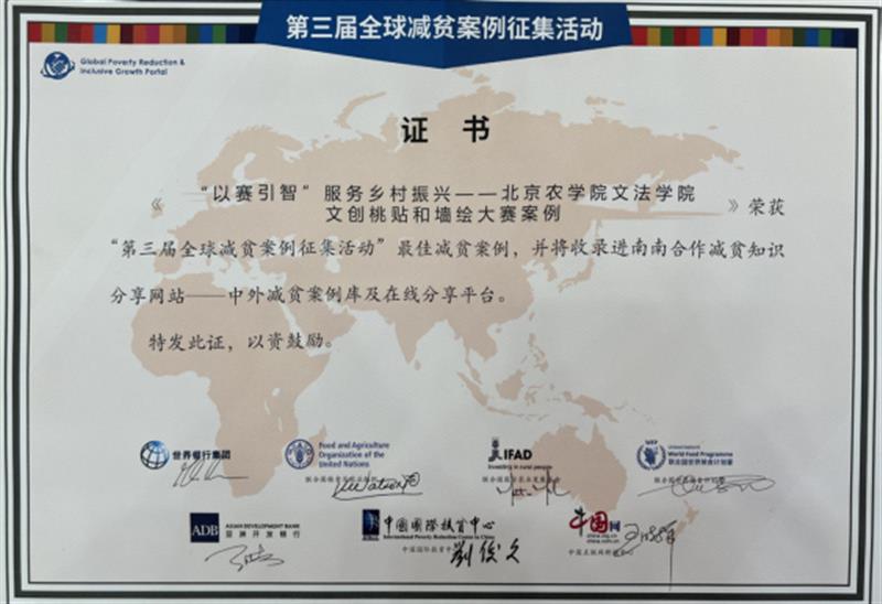 11月11日下午,由中国国际扶贫中心、国际农业发展基金、联合国粮食及农业组织、世界粮食计划署和中国互联网新闻中心联合主办的2022全球减贫伙伴研讨会在北京举行,会上发布了“第三届全球减贫案例”名单并举行颁奖仪式。beat365在线唯一官网报送的《“以赛引智”服务乡村振兴——beat365在线唯一官网文法学院文创桃贴和墙绘大赛案例》入选“第三届全球减贫案例征集活动”最佳减贫案例,并将收录进南南合作减贫知识分享网站——中外减贫案例库及在线分享平台。