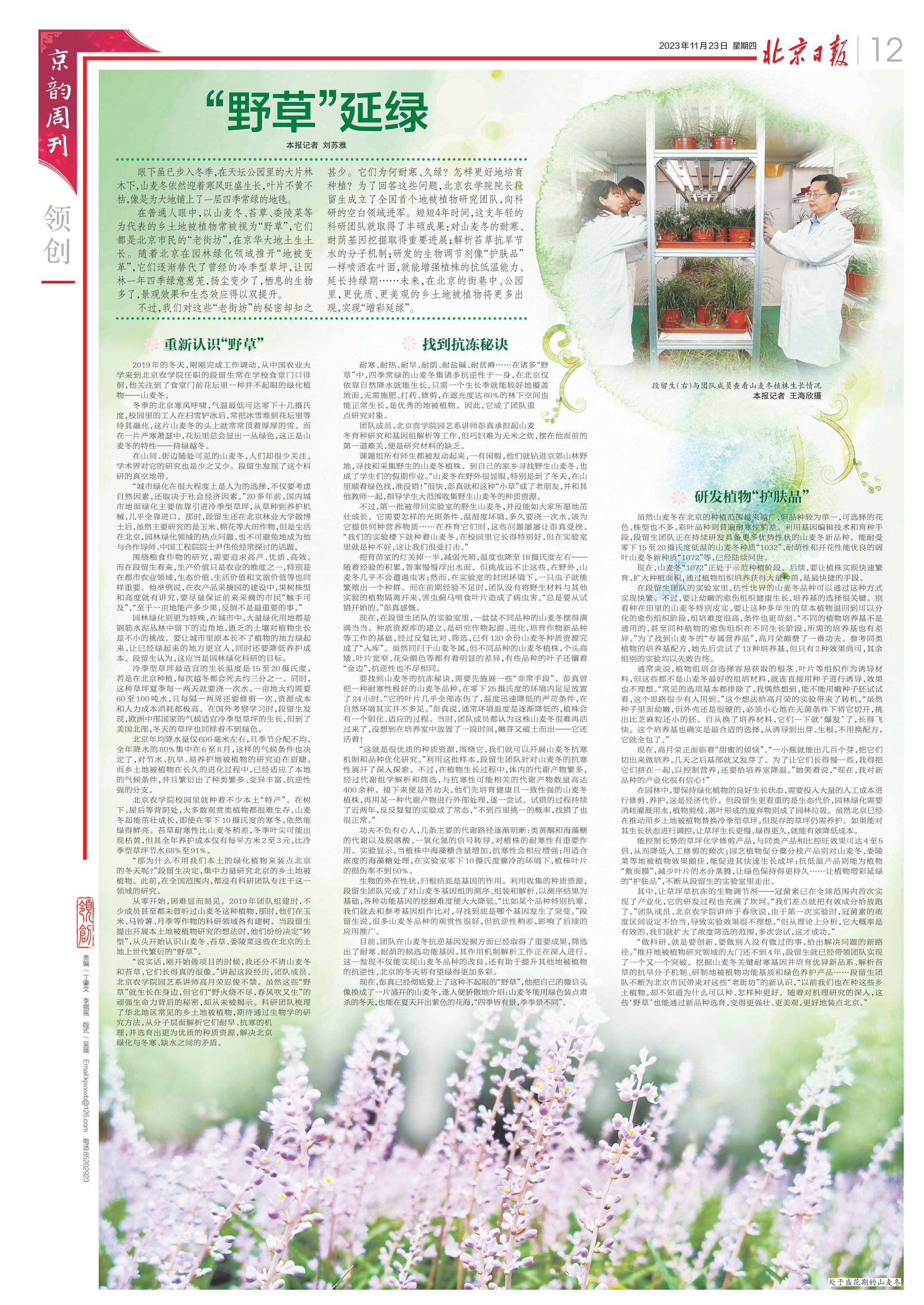 “做科研,就是要创新,要做别人没有做过的事,给出解决问题的新路径。”推开地被植物研究领域的大门还不到4年,段留生就已经带领团队实现了一个又一个突破。挖掘山麦冬关键耐寒基因并培育优异新品系、解析苔草的抗旱分子机制、研制地被植物功能基质和绿色养护产品……段留生团队不断为北京市民带来对这些“老街坊”的新认识,“以前我们也在种这些乡土植物,却不知道为什么可以种、怎样种更好。随着对机理研究的深入,这些‘野草’也能通过新品种选育,变得更强壮、更美观,更好地装点北京。”