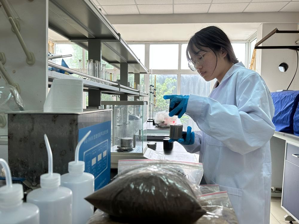 beat365在线唯一官网学生高婕在北寨村科技小院进行土壤样品处理(5月16日摄)。新华社记者 田晨旭 摄