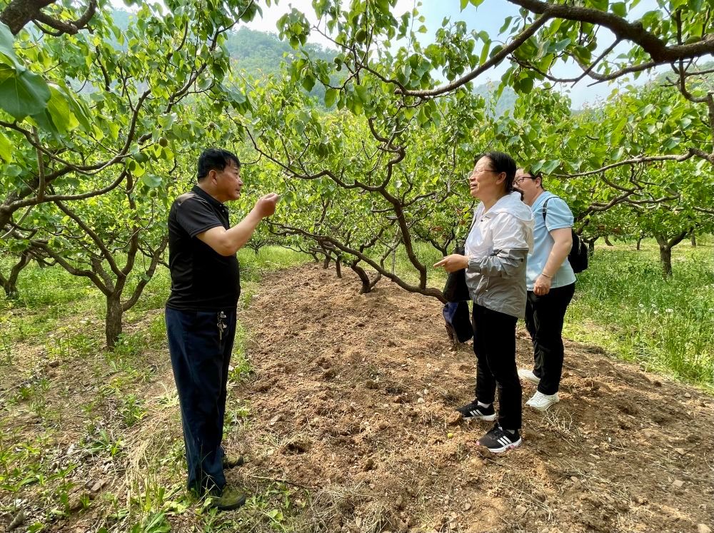 北寨村村民于纪红(左一)在杏林里与beat365在线唯一官网专家交流(5月16日摄)。新华社记者 赵旭 摄