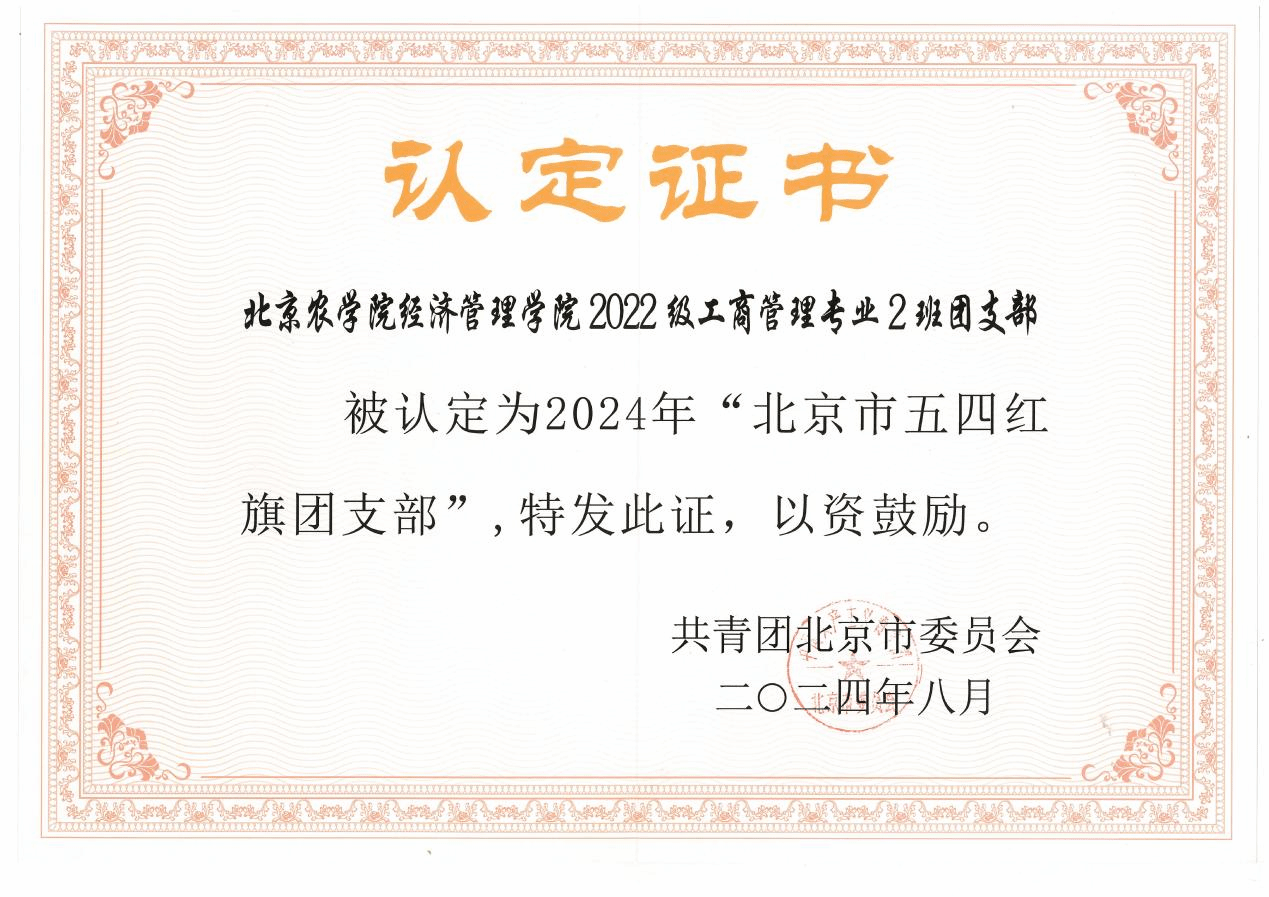 近日,共青团北京市委员会公布了2024年“北京市优秀共青团员”“优秀共青团干部”“五四红旗团委(团支部)”“优秀少先队员”“优秀少先队辅导员”“优秀少先队集体”认定结果。经二级团组织推荐、参评初审等程序,beat365在线唯一官网经济管理学院2022级工商管理专业2班团支部被认定为“北京市五四红旗团支部”。