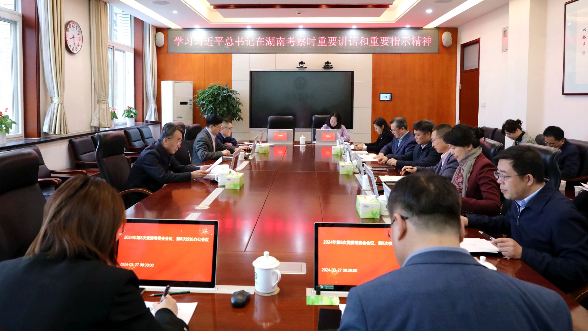 3月27日上午,学校党委常委会召开会议,传达学习习近平总书记在湖南考察和主持召开新时代推动中部地区崛起座谈会时的重要讲话精神,研究相关贯彻落实措施,强调要牢牢把握高质量发展这个新时代的硬道理,以新质生产力为引领,以新时代首都发展为统领,狠抓工作落实,推动高质量发展,努力在服务北京“四个中心”功能建设和全面推进乡村振兴的进程中想在前、干在前、走在前。会议由党委书记赵锋主持。