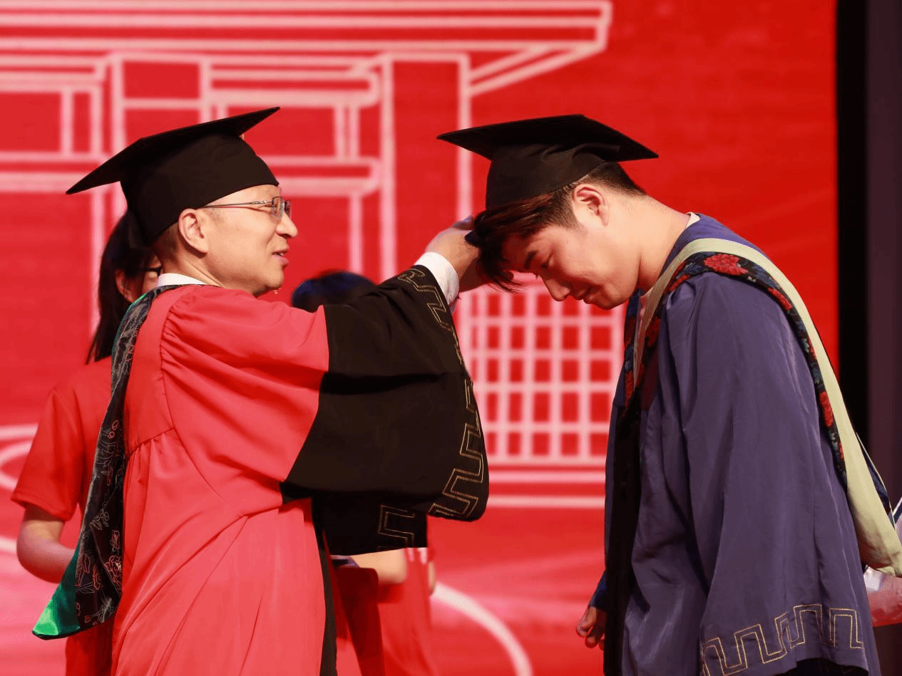 校领导、学院领导及学位委员会委员为全体毕业生一一拨正流苏。学校专门为每一位上台受礼的毕业生拍摄学位授予仪式导师合影照,记录珍贵而温情的一刻。