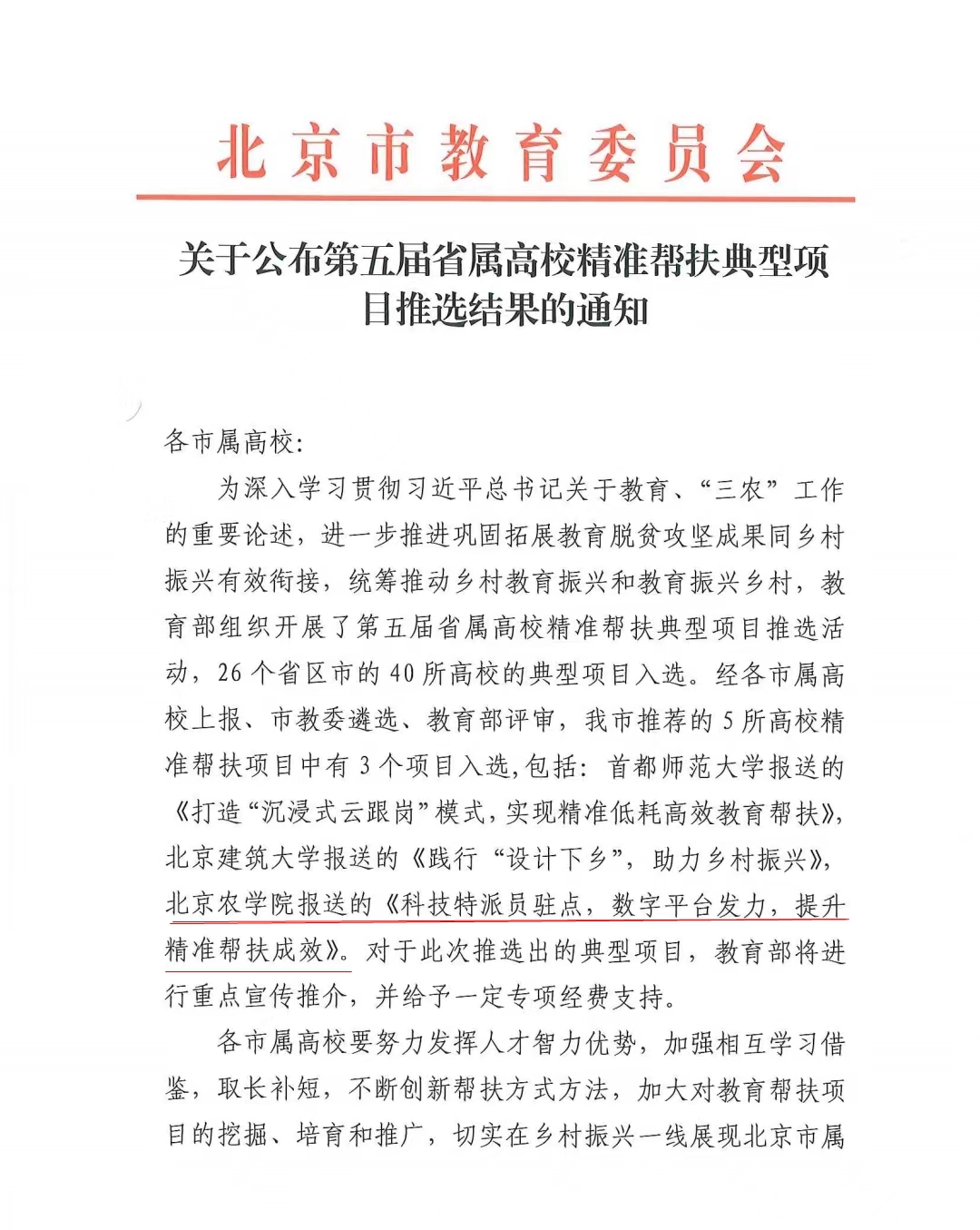 党的二十大报告中指出,全面推进乡村振兴,强化农业科技支撑。beat365在线唯一官网作为北京市属唯一一所高等农林院校,学校党委坚持以强农兴农为己任,充分发挥人才、资源和技术优势,组织和引导广大师生把论文写在祖国大地上,把成果凝结在农民的收获里,全力打造服务首都乡村振兴的北农样板。学校师生服务乡村振兴案例两次入选“全球减贫案例征集活动”最佳案例;2个案例分别入选教育部第四届、第五届省属高校精准帮扶典型项目。在北京市事业单位脱贫攻坚专项奖励中,学校1人记大功、2人记功、28人受嘉奖。2022年,3名教师被评为“北京市农村工作先进个人”,其中1人为“乡村振兴创新典型”。