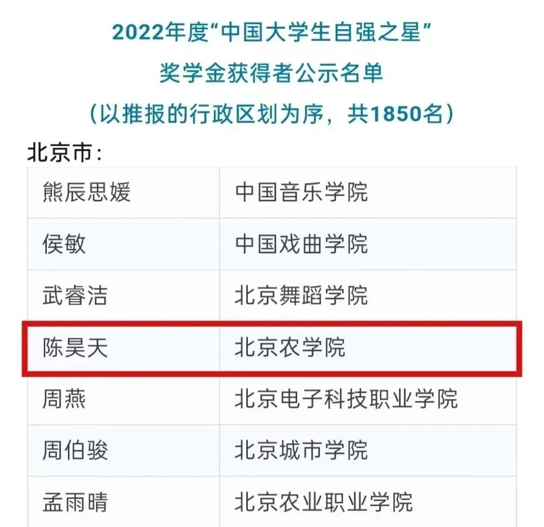 近日,由共青团中央、全国学联指导,中国青年报社等单位联合开展的2022年度“中国大学生自强之星”奖学金推报评选工作结果揭晓。beat365动物科学技术学院2020级动物科学专业1班本科生陈昊天同学荣获2022年度“中国大学生自强之星”奖学金。