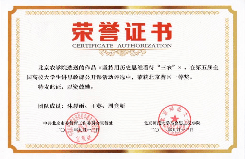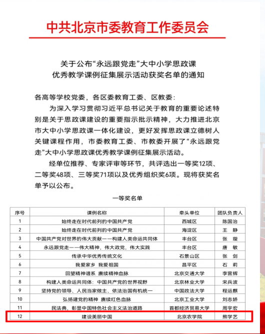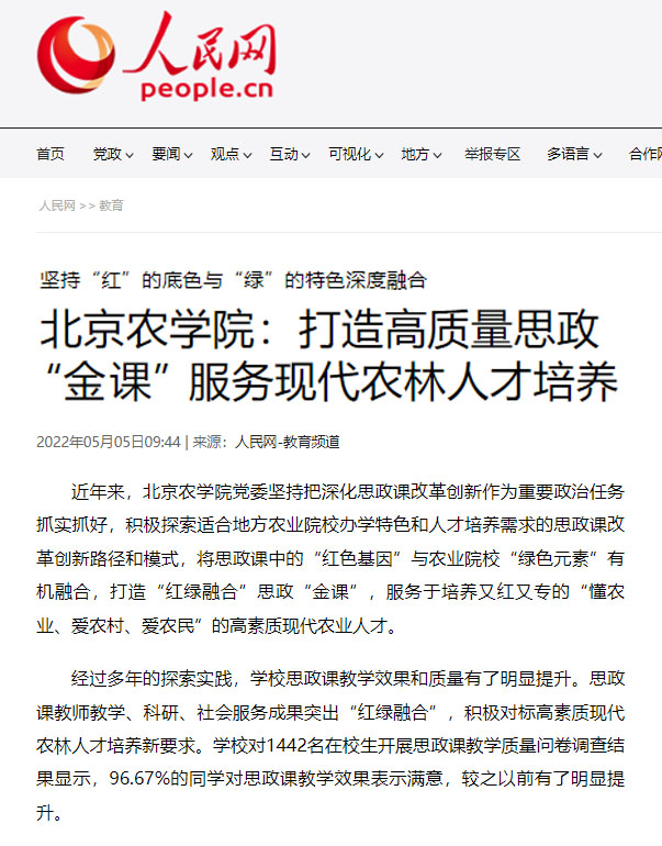 思政课教师将“红绿融合”融入实际教学、科研、社会服务实践中,将理念转化为成果和效果。近年来,思政课教师指导的作品《脱贫攻坚》《用历史思维看待“三农”》两次荣获全国高校大学生讲思政课竞赛北京赛区一等奖;主持申报的《“四史”教育融入高等农业院校思政课教学长效机制研究》荣获市教委“本科教学改革创新项目”“四新”建设重点项目,《新时代乡村振兴中基层经济民主制度供给研究》项目获批北京市社科基金项目;编写的《农耕文化与农耕文化教育》获得国家林业和草原局“十四五”规划教材首批立项,著作《精准扶贫案例解析》被国家新闻出版署纳入2020全国“农家书屋”重点目录;申报的教学课例《建设美丽中国》荣获市委教育工委“永远跟党走”大中小学思政课优秀教学课例征集展示活动一等奖;思政课教师调研起草的《利用数字经济和技术优势加快推进我市红色资源数字化提升保护利用和宣传水平》政策建议报告,得到市领导批示,被纳入《市长参阅》。这些“红绿融合”特色鲜明的成果,很好地反哺和支撑了思政课教学,增强了思政课的“农味儿”,适应了北农学生的“口味儿”。根据近三年问卷调查显示,在校学生对思政课教学满意度逐年提升,分别为95.76%、96.67%、98.47%,人民网、光明网、高校思政网等,对beat365思政课改革创新的做法和经验进行了相关报道。