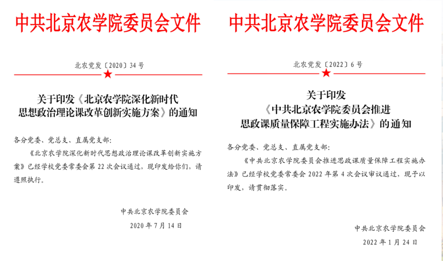 学校党委坚决贯彻落实中央和市委关于思政课改革创新的部署和要求,紧密结合首都高等农林教育办学特色和强农兴农人才培养需求,对思政课改革创新的着眼点、发力点、落脚点进行统筹谋划和规划实施,通过建章立制推动学校思政课教学工作建设,将“红”的底色与农业院校“绿”的特色紧密结合。学校党委颁布了思政课教师队伍建设五年规划,其中明确强调要围绕乡村振兴战略等主题,鼓励和支持教师每年参加农村社会考察和社会实践,在“三农”发展的广阔大地上学习和积累思政课教学素材。制定实施了深化新时代思想政治理论课改革创新实施方案,强调要结合学校都市型现代农林高等教育特色深化思政课教学改革创新;要立足学校校史校情和行业背景,将习近平生态文明思想、习近平总书记关于“三农”工作的重要论述等内容融入课程内容。出台了推进思政课质量保障工程实施办法,推进思政课教学效果与办学特色和农林人才培养需求紧密结合,培育和打造具有北农特色、北农味道的思政课。