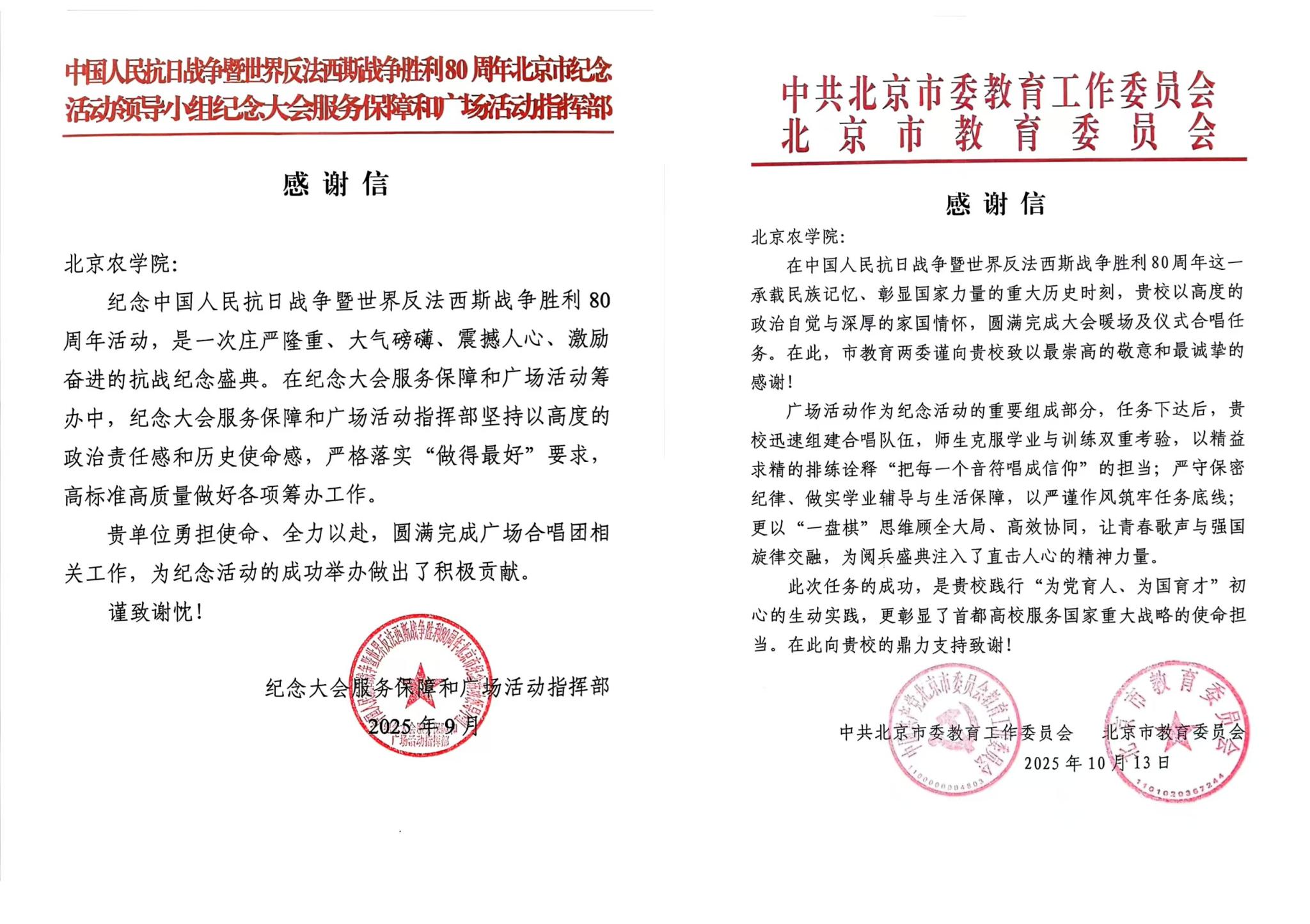 学校师生圆满完成纪念中国人民抗日战争暨世界反法西斯战争胜利80周年大会天安门广场合唱及保障任务,将理想信念融入使命担当,用信仰与奉献、热爱与坚持共上一堂生动而深刻的爱国主义“大思政课”。学校收到来自中共北京市委教育工作委员会、北京市教育委员会与纪念大会服务保障和广场活动指挥部的两封感谢信,信中对学校在纪念大会广场活动中作出的贡献给予高度评价,称赞北农师生“彰显了首都高校服务国家重大战略的使命担当”。