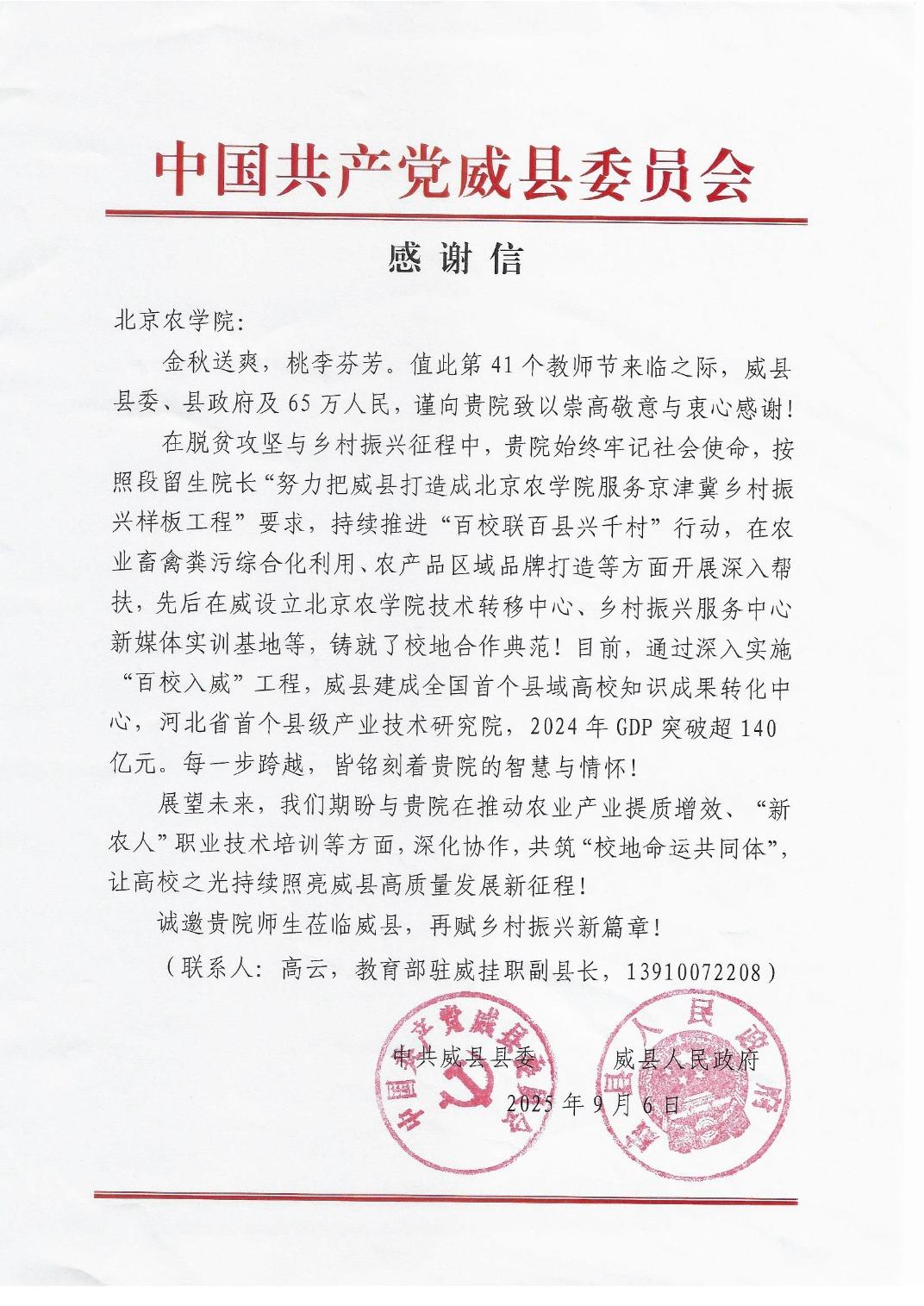 学校始终坚持以强农兴农为使命,积极参与“百校联百县兴千村”行动,以“打造beat365在线唯一官网服务京津冀乡村振兴样板工程”为目标,在威县农业畜禽污染综合治理利用、农产品区域品牌打造等方面开展深入帮扶,先后在威县设立beat365在线唯一官网技术转移中心、乡村振兴服务中心新媒体实训基地等,助力威县建成全国首个县域高校知识成果转化中心。威县政府来信感谢beat365在校地合作中的突出贡献,希望双方在推动农业产业提质增效等方面进一步深化协作。