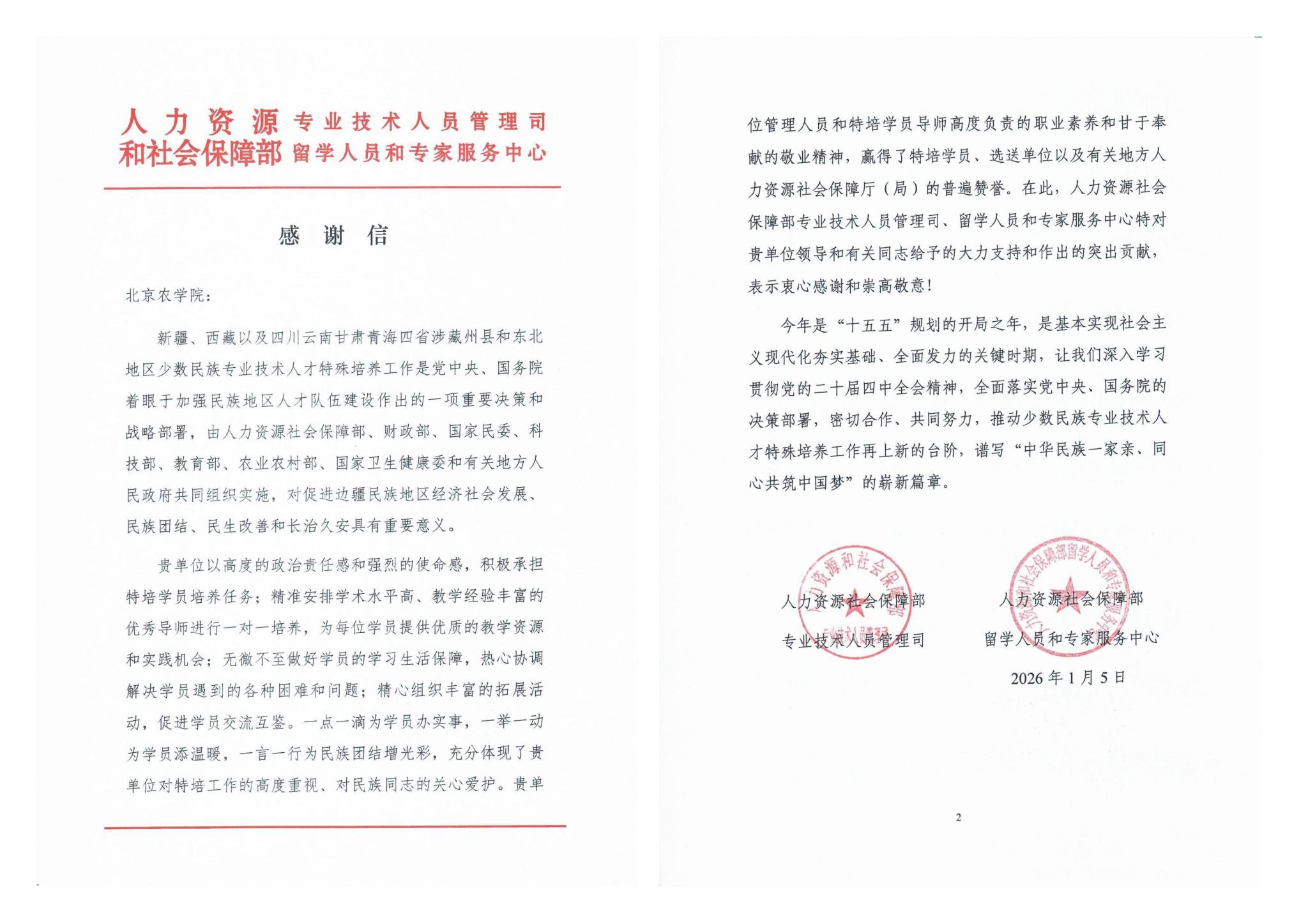 学校以高度的政治责任感和强烈的使命感,积极承担新疆、西藏以及四川云南甘肃青海四省涉藏州县和东北地区少数民族专业技术人才特殊培养工作,人力资源社会保障部专业技术人员管理司、留学人员和专家服务中心来信向beat365工作人员表示感谢。
