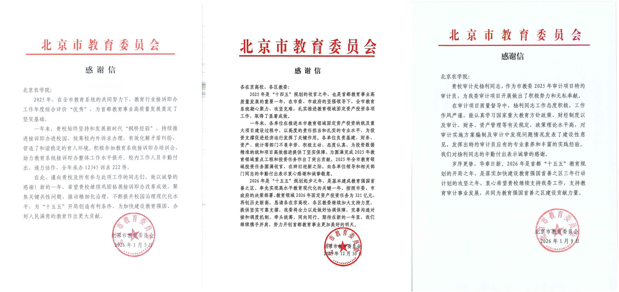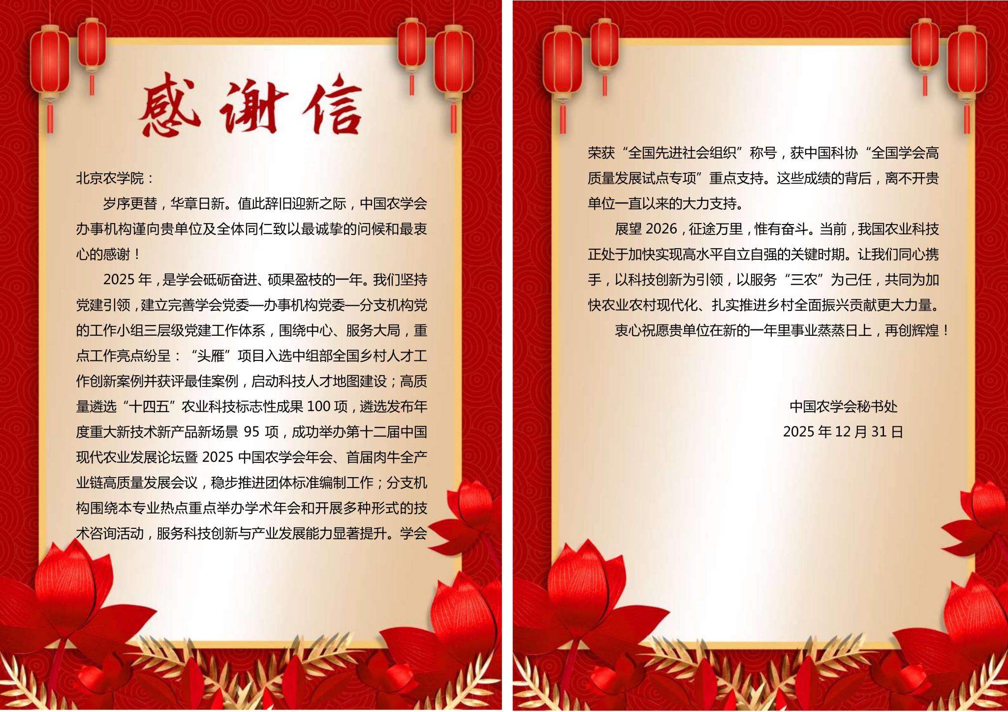 2025年,学校深入学习贯彻党的二十届四中全会精神和全国全市教育大会精神,服务国家重大战略和新时代首都发展需求,在服务保障重大活动、科技赋能乡村振兴、思政育人等领域取得扎实成效,用实干实绩交出了立德树人、强农兴农的优异答卷。近日,纪念大会服务保障和广场活动指挥部、农业农村部、中国农学会秘书处、北京市委教育工委、北京市教委、“大思政课” 实践教学发展研究中心、河北威县等单位或组织先后发来感谢信,对学校师生作出的积极贡献表示衷心感谢。