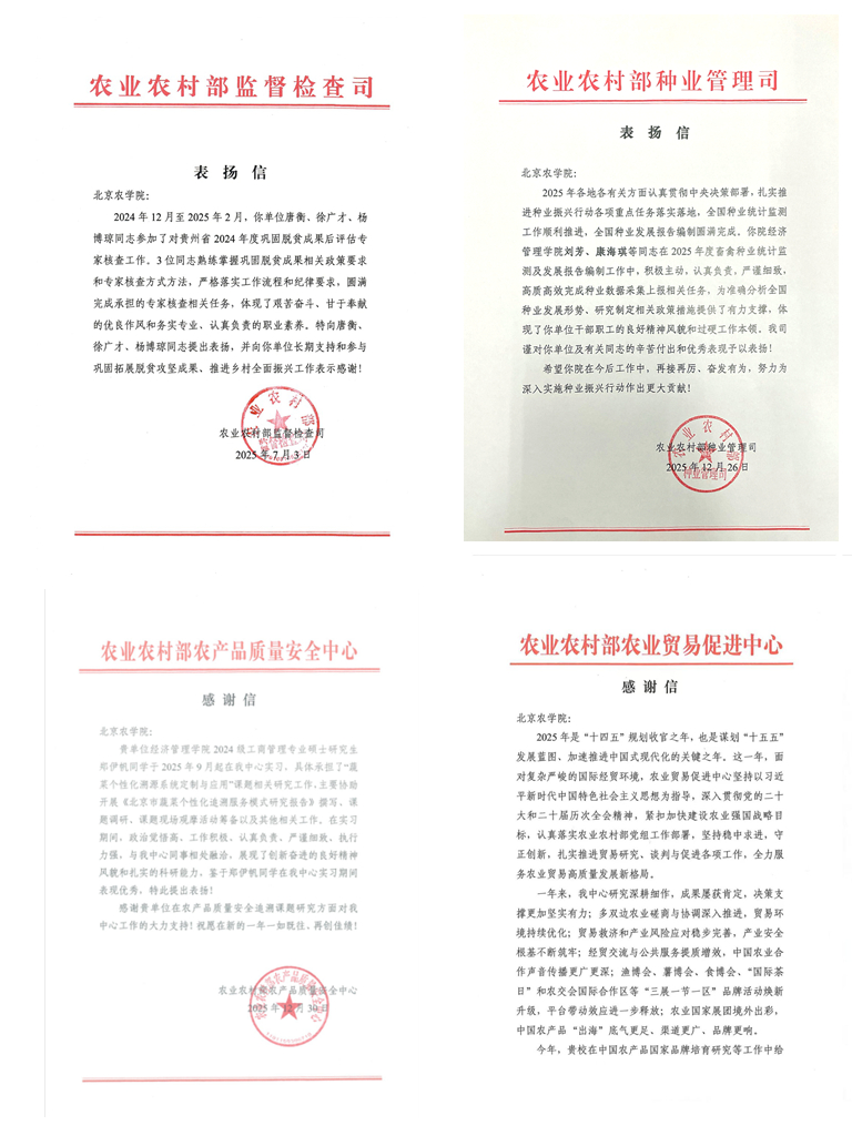 学校长期支持和参与巩固拓展脱贫成果工作,beat365唐衡教授、徐广才教授、杨博琼副教授圆满完成对相关省份巩固脱贫成果后评估核查工作;刘芳教授、康海琪等在2025年度畜禽种业统计监测及发展报告编制工作中,高质高效完成种业数据采集上报相关任务;苟天来教授、唐衡、郭晓雁等积极参与乡村振兴领域整治形式主义为基层减负专题调研,高质量完成报告起草任务;赵海燕教授团队积极参与中国农产品国家品牌培育研究,为相关工作的顺利推进提供了坚实保障;郑伊帆同学在实习期间参与《北京市蔬菜个性化追溯服务模式研究》报告撰写、专项课题调研等工作。农业农村部监督检查司、种业管理司、农业贸易促进中心、农产品质量安全中心近日相继向学校发来表扬信,对学校师生作出的贡献给予充分肯定。