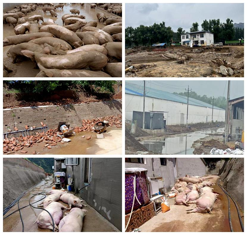 位于密云区大城子镇墙子路村的北京隆盛养殖场,因暴雨致使墙体倒塌、水电中断,155头生猪因热应激和缺水死亡,生产体系遭受重创。穆家峪镇荆子峪村的北京穆家峪精育种猪有限公司也损失了135头育肥猪。针对这一状况,团队迅速做出响应赶赴现场,对损失进行系统评估,制定应急计划,并配送相应物资,获得了养殖场负责人的高度认可。
